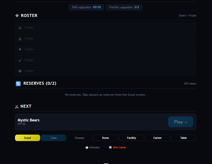 Build a team from nothing. Scout unknown rookies. Train their stats. Master their champions. Draft the perfect comp. Watch them fight on a live battle map. Climb from Bronze to World Champion.