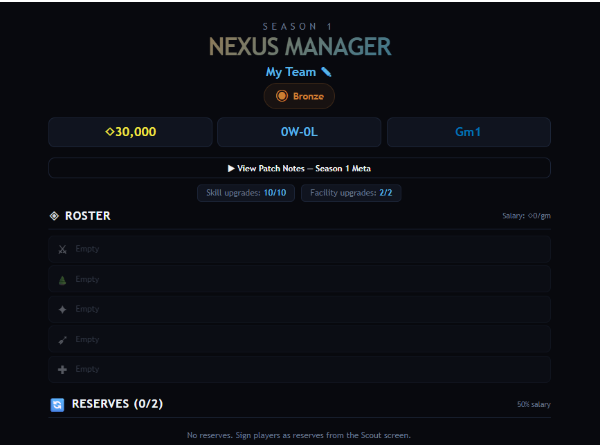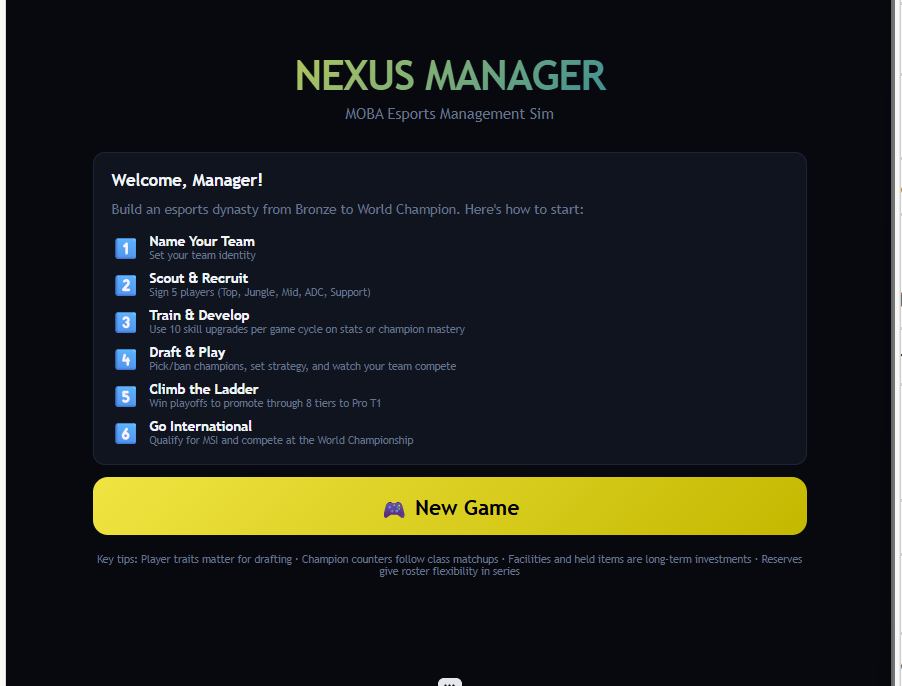 Nexus Manager is a deep esports management sim inspired by Teamfight Manager, Esports Godfather, and MOBA Team Manager — built as a single HTML file you can play right here in your browser.