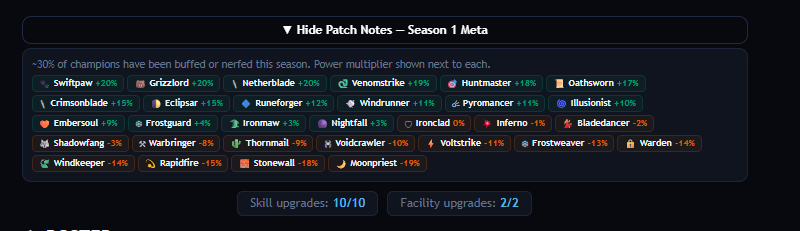 100 Unique Champions across 12 classes and 5 roles, each with passive and ultimate abilities, class counter matchups, and meta shifts every season.