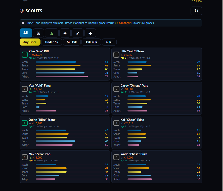 Reach Platinum to unlock B-grade recruits. Challenger unlocks elite S/S+ players — but they come with baggage (20% chance of negative traits or weakened stats).